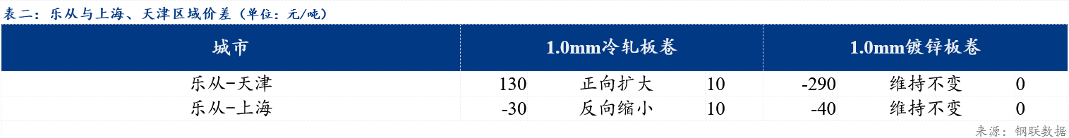 今日冷轧板卷乐从与天津价差较上一交易日扩大10元/吨,乐从与上海价差较上一交易日收窄10元/吨;镀锌板卷乐从与天津价差较上一交易日持平,与上海价差较上一交易日持平。品种价差方面,镀冷价差较上一交易持平,镀热价差较上一交易日收窄10元/吨,冷热价差较上一交易日收窄10元/吨。