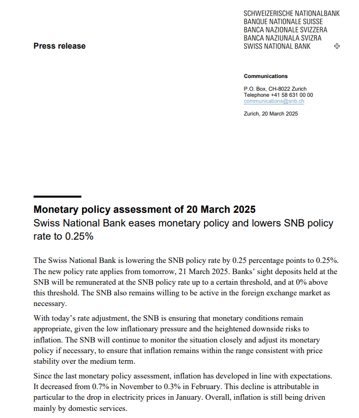 3月20日,瑞士央行周四将政策利率从0.5%下调至0.25%,为自2022年9月以来的最低利率,是连续第五次降息,符合预期。