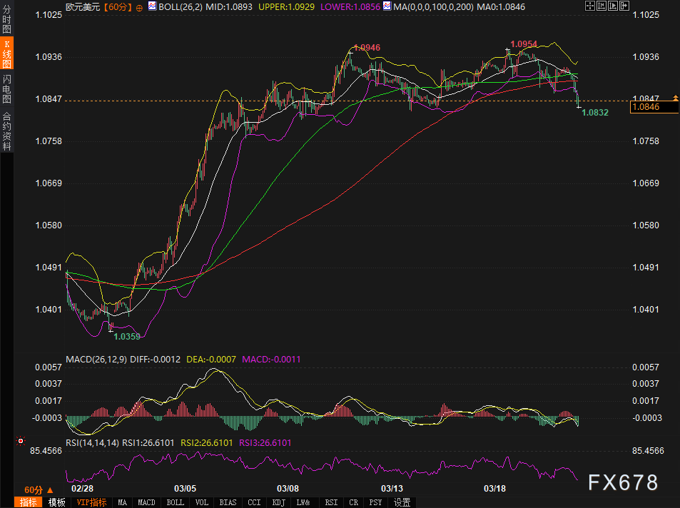 60分钟级别显示,汇价在欧盘早盘跌破1.0850支撑后加速下行,但在触及1.0830后快速反弹至1.0860附近,形成“锤子线”形态。动能指标出现背离信号:RSI(14)在价格创新低时未能跌破30超卖区,MACD柱状体亦在零轴下方收窄,暗示空头动能减弱。若价格能站稳1.0850(3月19日亚洲时段低点),可能向上测试1.0880(日内第一阻力)。