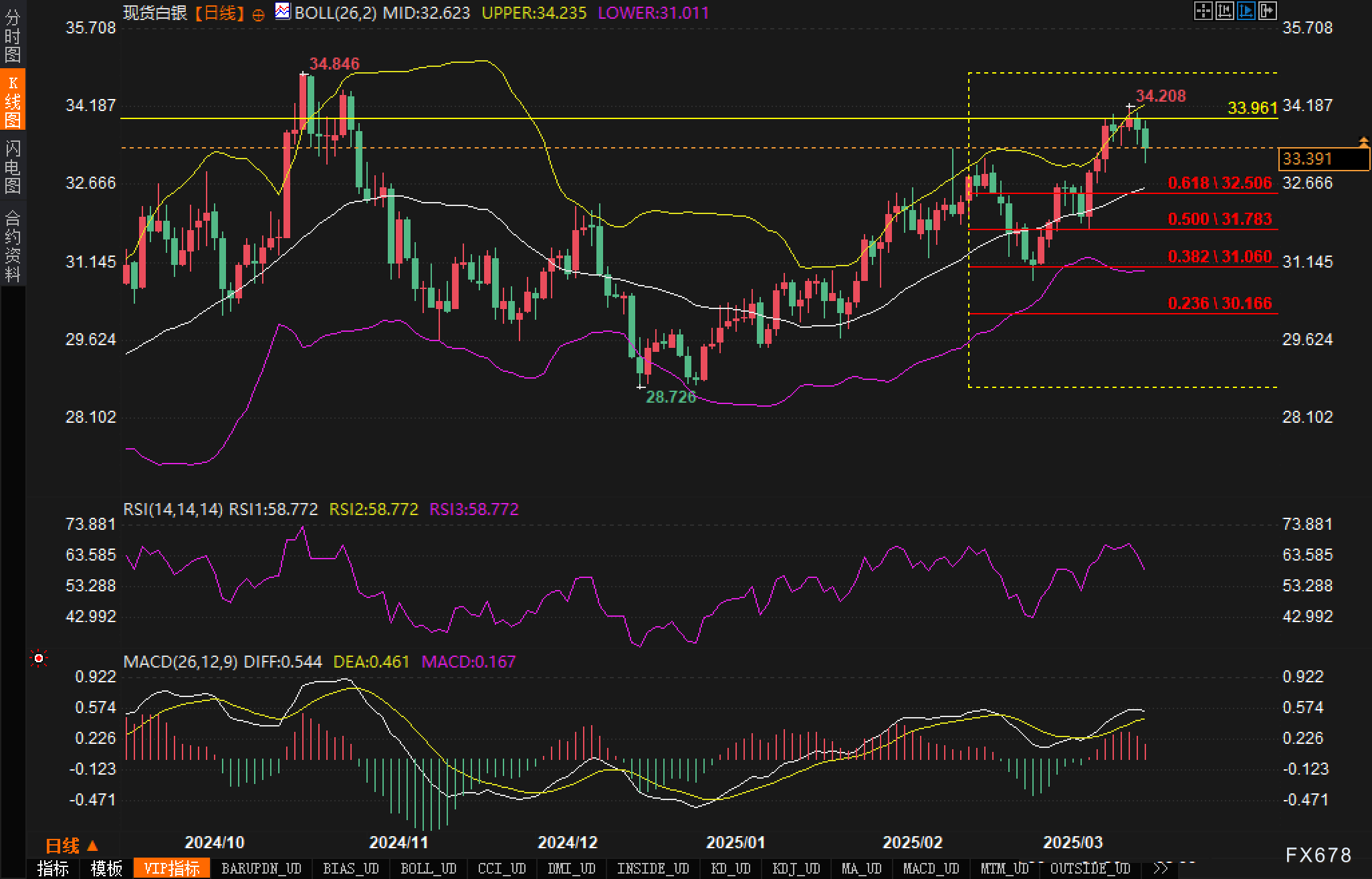 日线级别显示,布林带中轨位于32.623美元,当前白银价格自上轨34.235美元区域承压回撤。值得注意的是,前期高点34.208美元和34.187美元位置与上轨几乎重合,说明短期多头动能在34美元上方遭遇明显阻力。