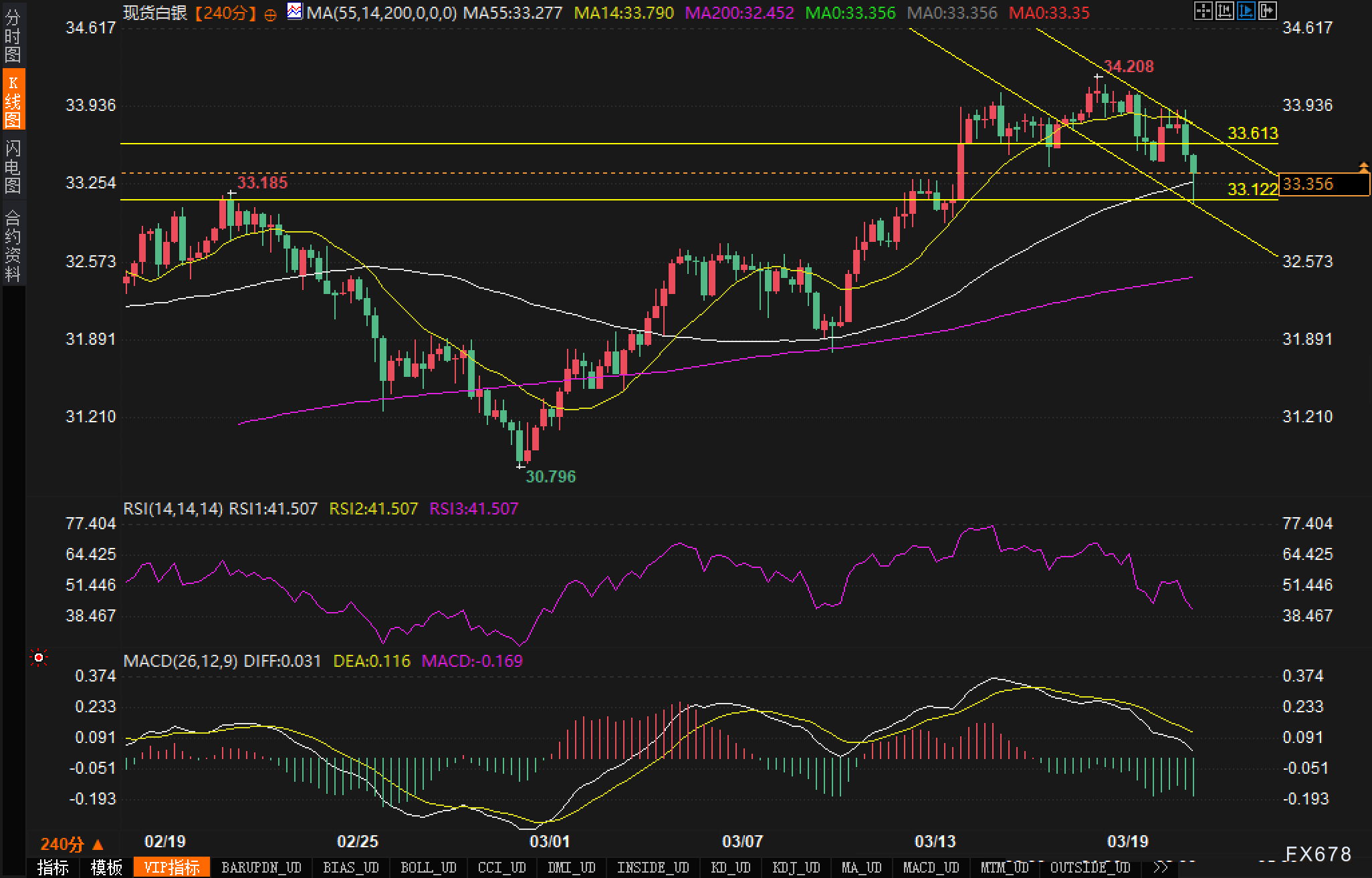 从4小时图可观察到,白银自触及34.208美元后呈现高位回落,并形成一条短期下行通道的形态。近期价格在33.613美元一线受阻后继续走低,最低回踩至33.122美元附近。随后虽然有所反弹,但33.360美元附近的水平压制与斜向下降趋势线共同构成阻力,使得反弹动能有限。