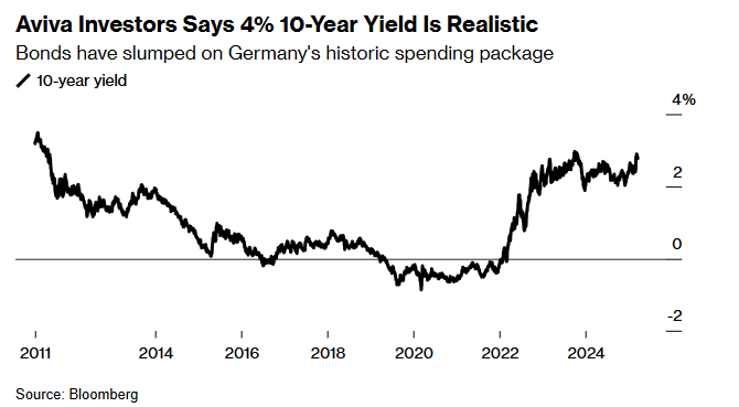 英杰华投资公司(Aviva Investors)认为,随着德国借贷成本的重新调整,德国10年期国债收益率可能上升至4%。
