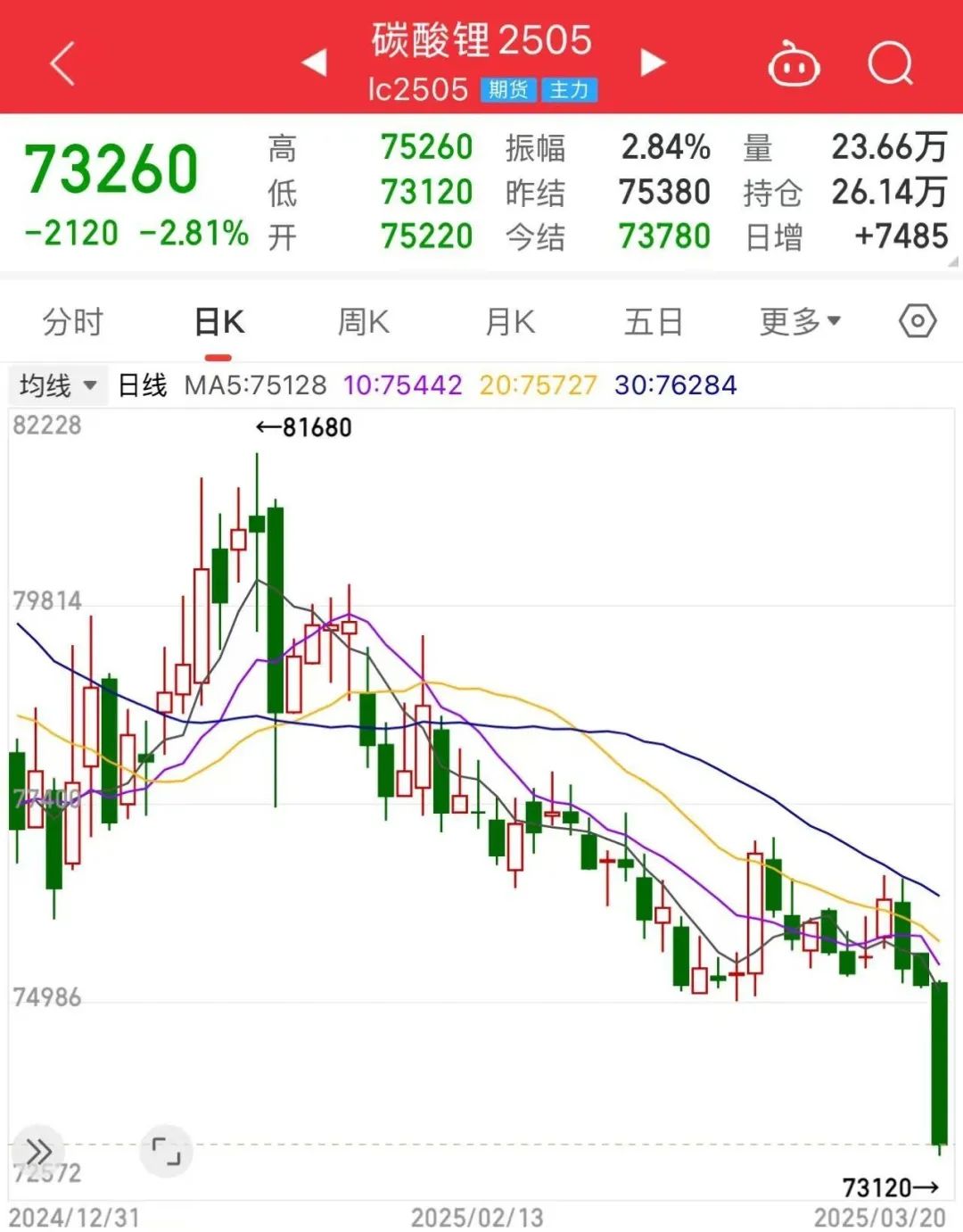 横盘整理近一个月的碳酸锂期货在3月20日迎来方向选择。当日,碳酸锂期货低开低走,增仓放量破位下跌,截至收盘主力合约报73260元/吨,下跌2.8%,创下阶段新低。