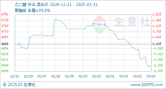 3月21日,生意社乙二醇基准价为4603.33元/吨,与本月初(4681.67元/吨)相比,下降了-1.67%。