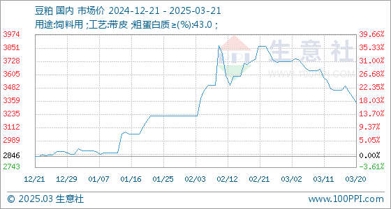 3月21日,生意社豆粕基准价为3346.00元/吨,与本月初(3722.00元/吨)相比,下降了-10.10%。
