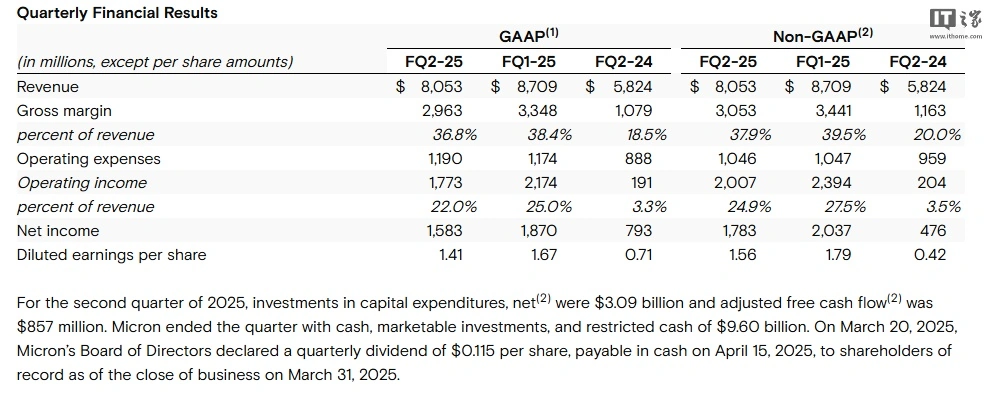 IT之家 3 月 21 日消息,美光科技公司今日公布了截至 2025 年 2 月 27 日的 2025 财年第二季度业绩:
