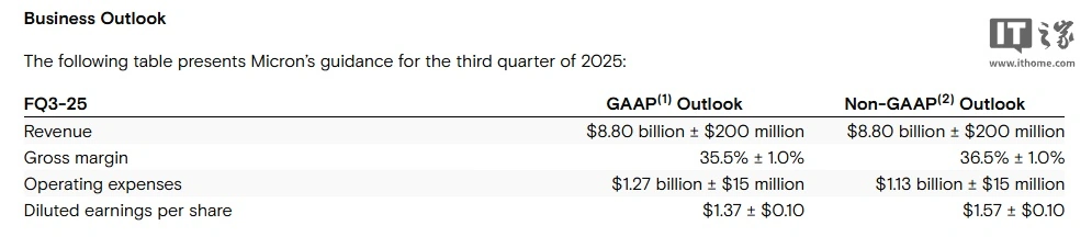 展望 2025 财年第三季度,美光预计营收可达 80 亿美元(现汇率约合 578.59 亿元人民币),上下浮动 2 亿美元;GAAP 和非 GAAP 毛利率均为 36.5%,上下浮动 1%。