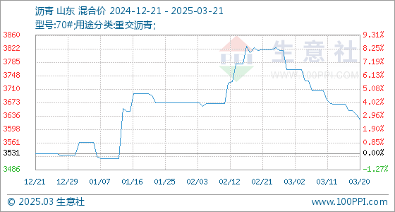 3月21日,生意社沥青基准价为3625.20元/吨,与本月初(3765.20元/吨)相比,下降了-3.72%。