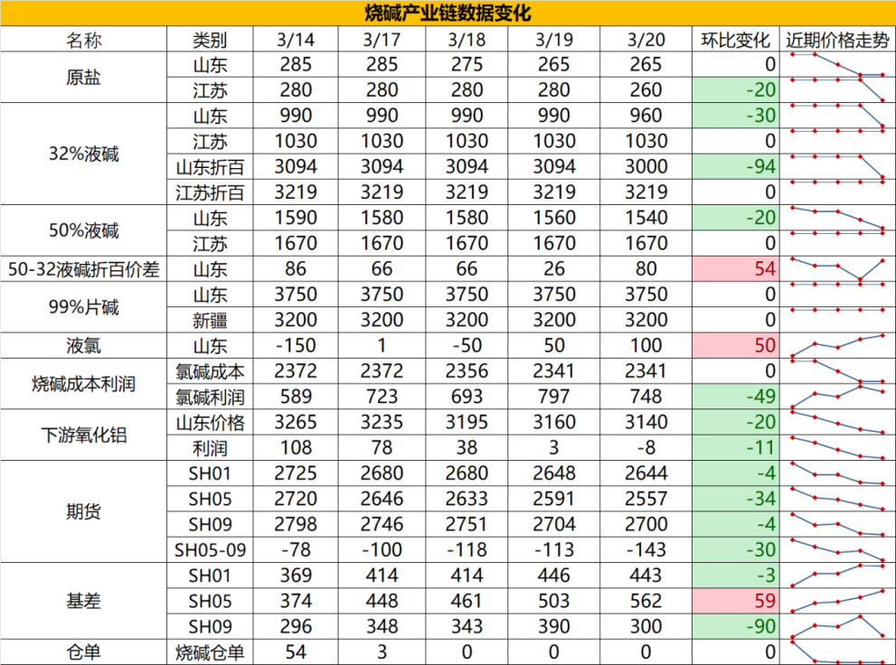 2. 中长期看,氧化铝虽然存在阶段性检修预期以及老产能淘汰预期,但前期积累的新装置投产对于烧碱刚需增量仍然会慢慢显现,而夏季氯碱装置的检修也会增多,同时伴随着非铝需求的季节性走强,3-4季度可能是烧碱从量变到质变供需面真实走好的过程。