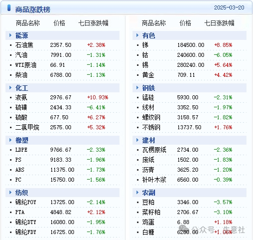 | 商品 | 行业 | 3月20日 | 单位 | 日涨跌 |