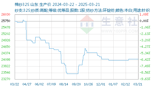据生意社商品行情分析系统显示:需求疲软抑制交投,本周常规棉纱价格呈现小幅下探趋势。截至3月21日,国内山东地区21S纯棉环锭纺现货参考价格在22600元/吨左右,与上周持平;32S纯棉环锭纺现货参考价格在24100元/吨左右,与上周持平。