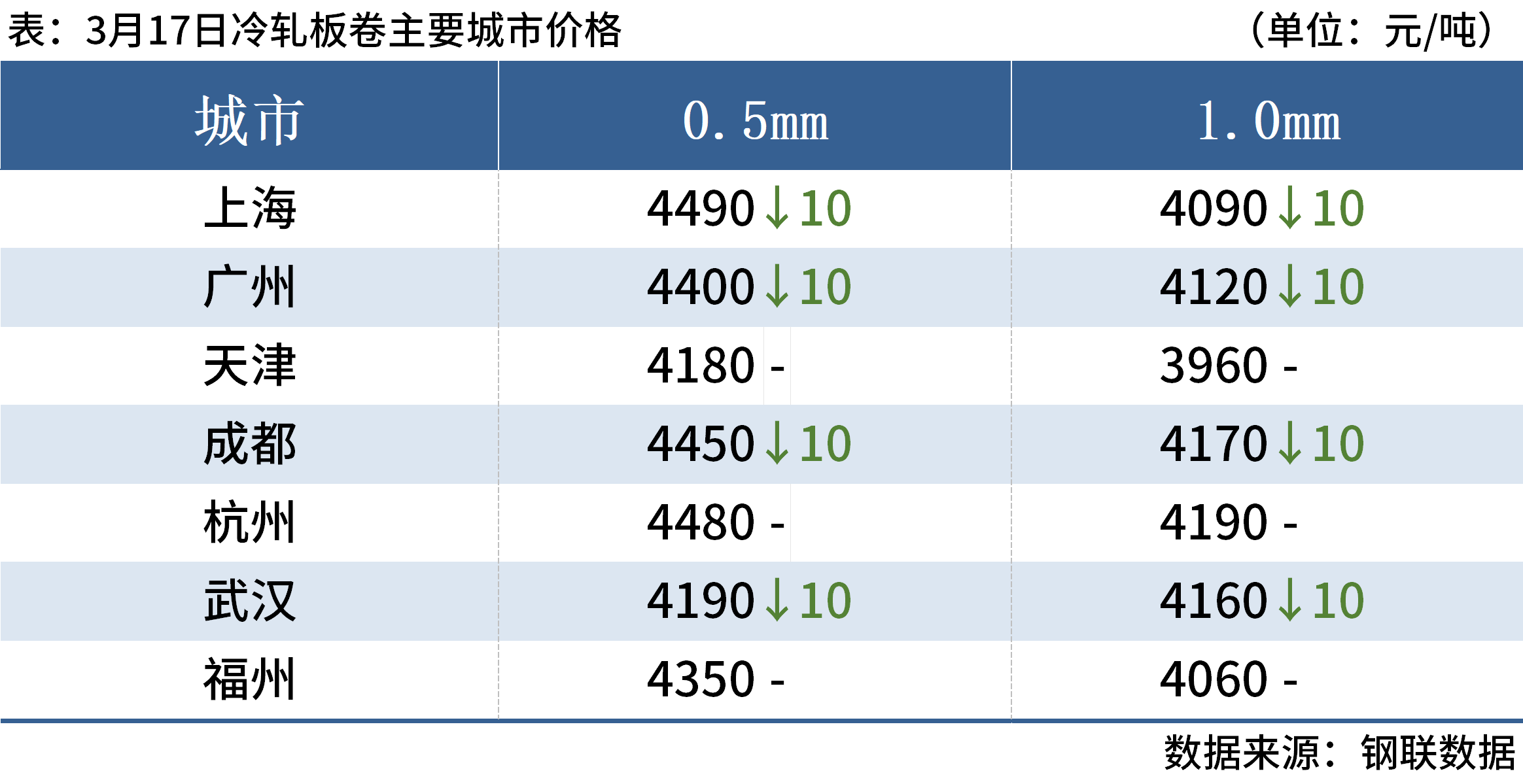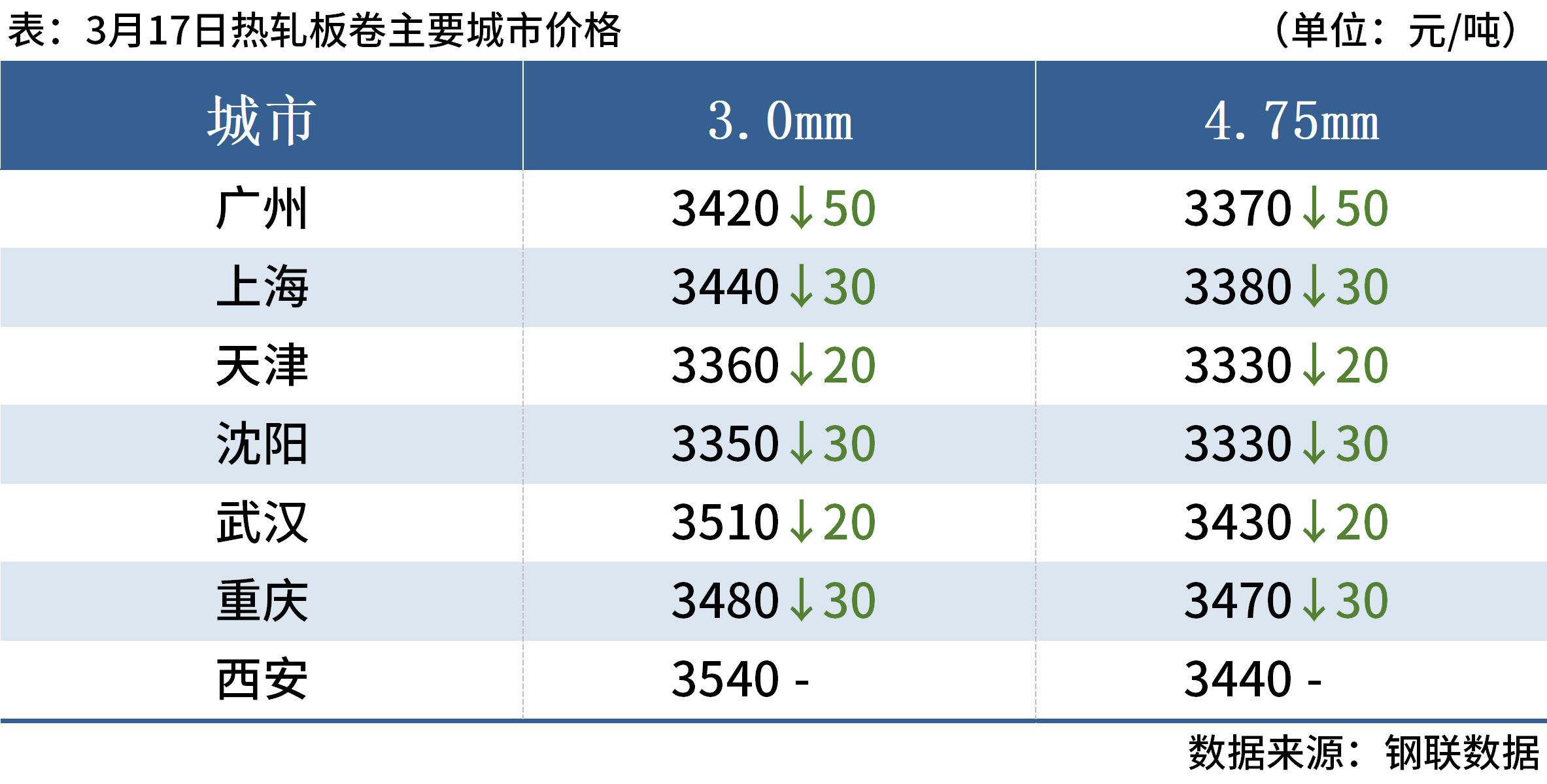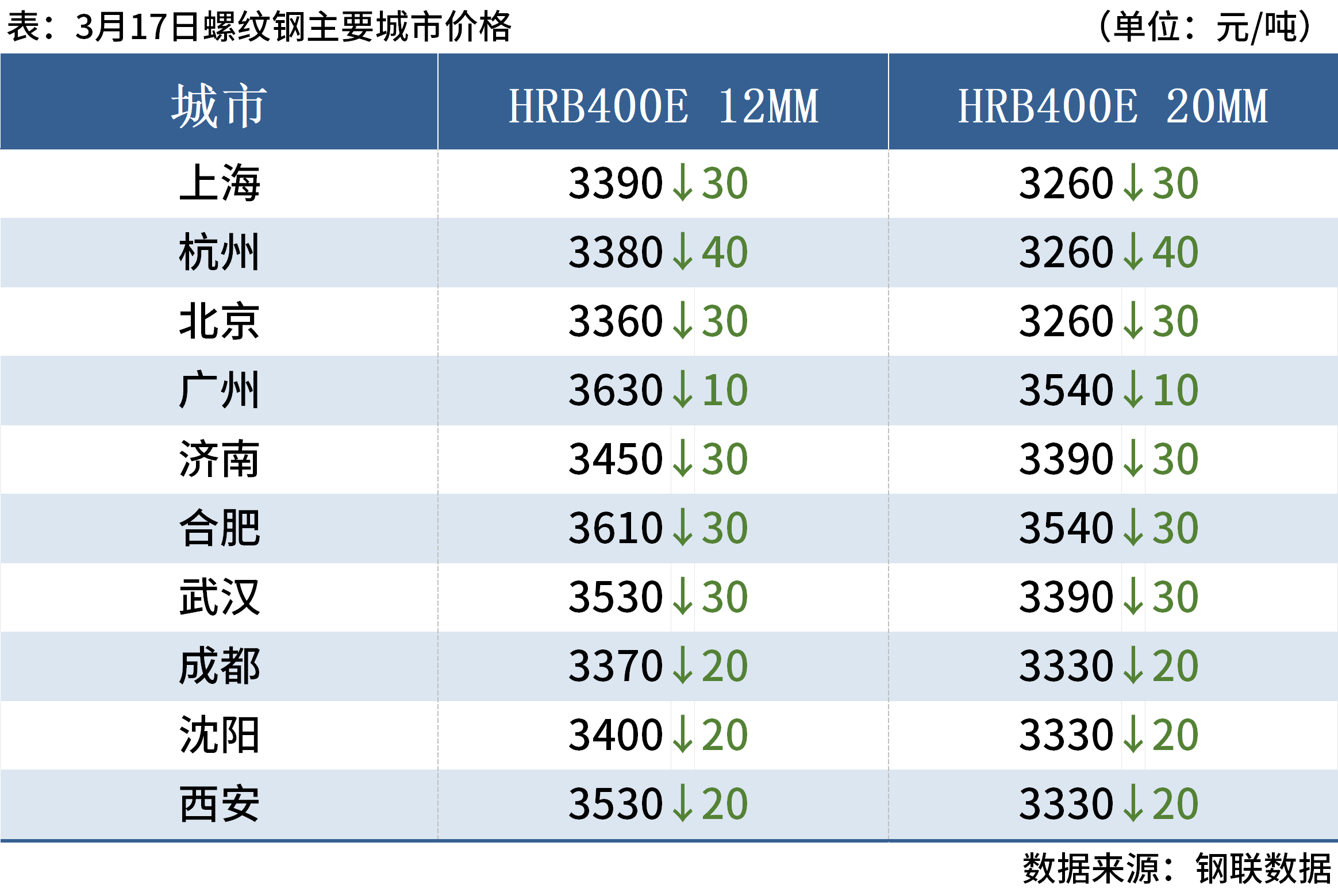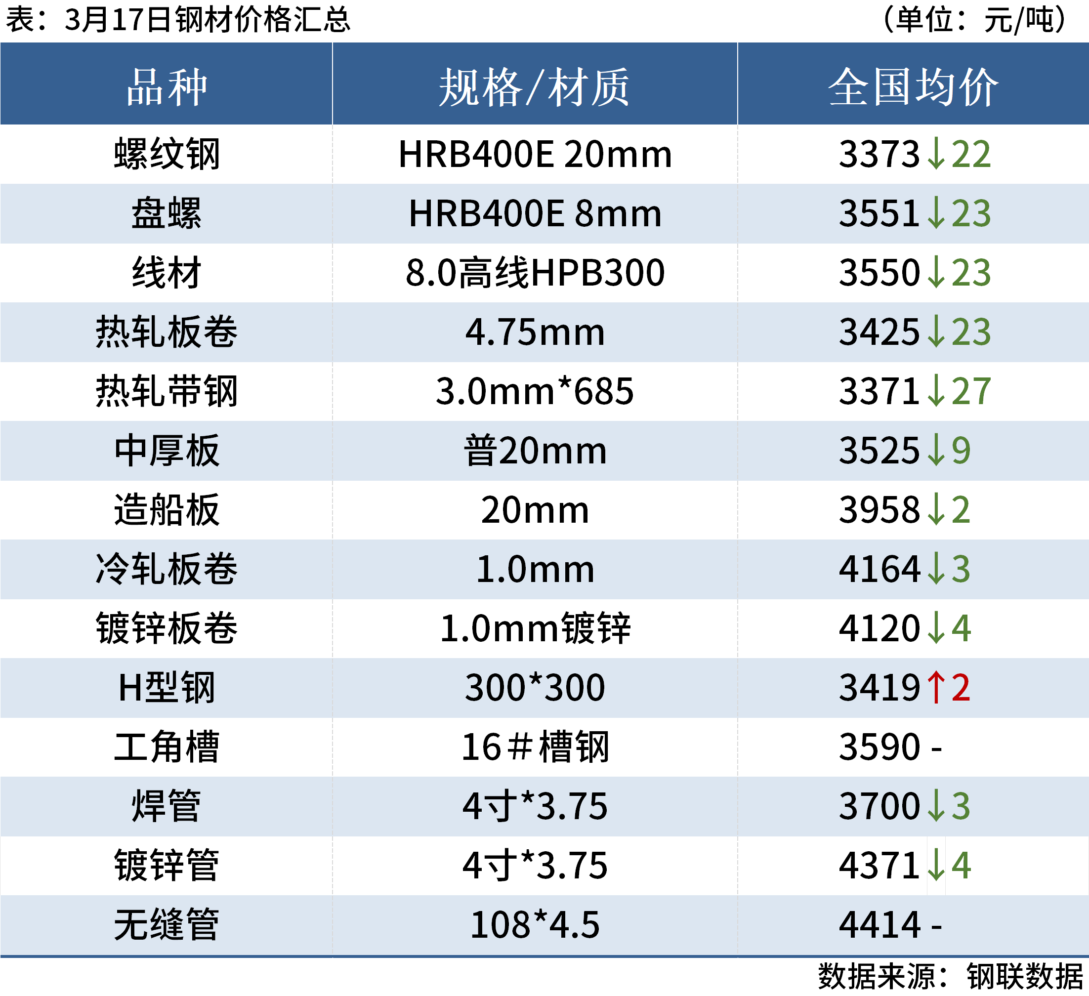 3月17日,国内钢材市场价格继续下跌,唐山普方坯出厂价下跌20报3040元/吨。黑色期货延续跌势,现货市场需求冷清,商家多观望,成交表现清淡。