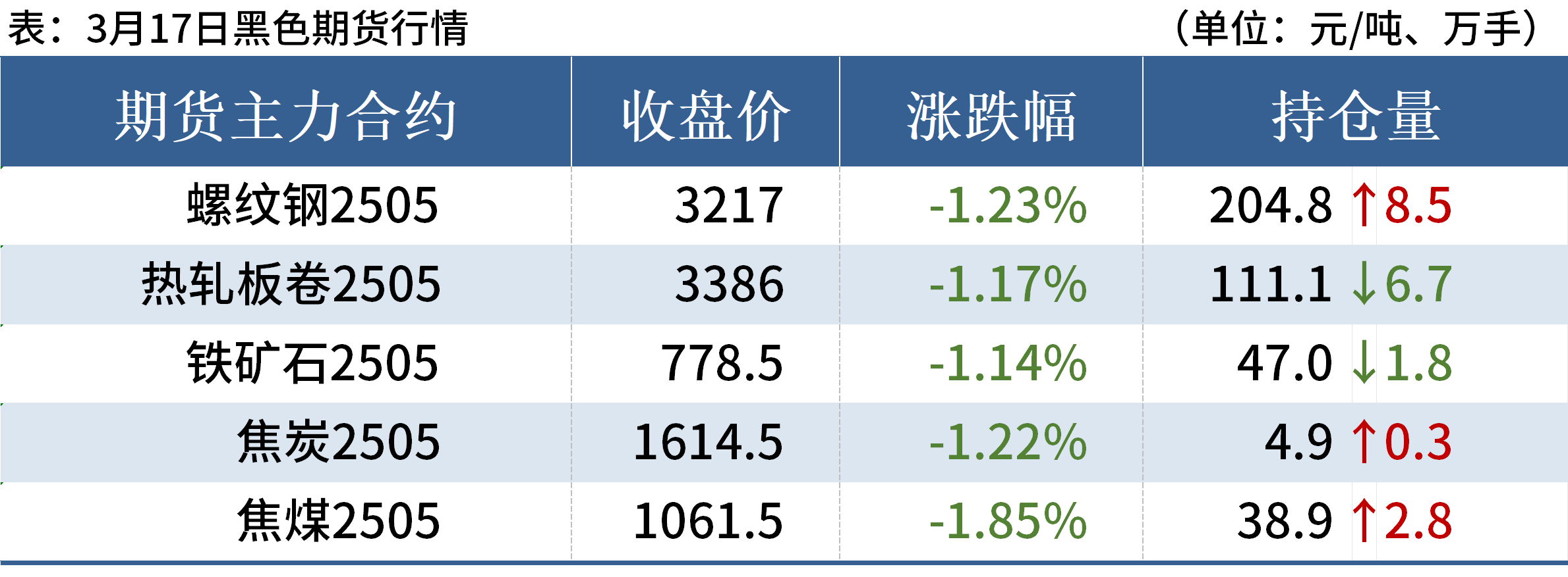焦炭:3月17日,市场价格偏弱运行,焦企生产情况稳定,原料先行让步为焦企留出利润空间,短期内焦企并无减产预期,焦炭价格第11轮提降基本落地后,后续价格下行空间有限,焦炭价格或将止跌企稳。原料端煤价持续承压,主流大矿生产情况稳定。随着国内市场主流大矿炼焦煤季度长协价格下调,焦煤价格持续下探逐步接近矿端成本线,后续下行空间进一步收窄。