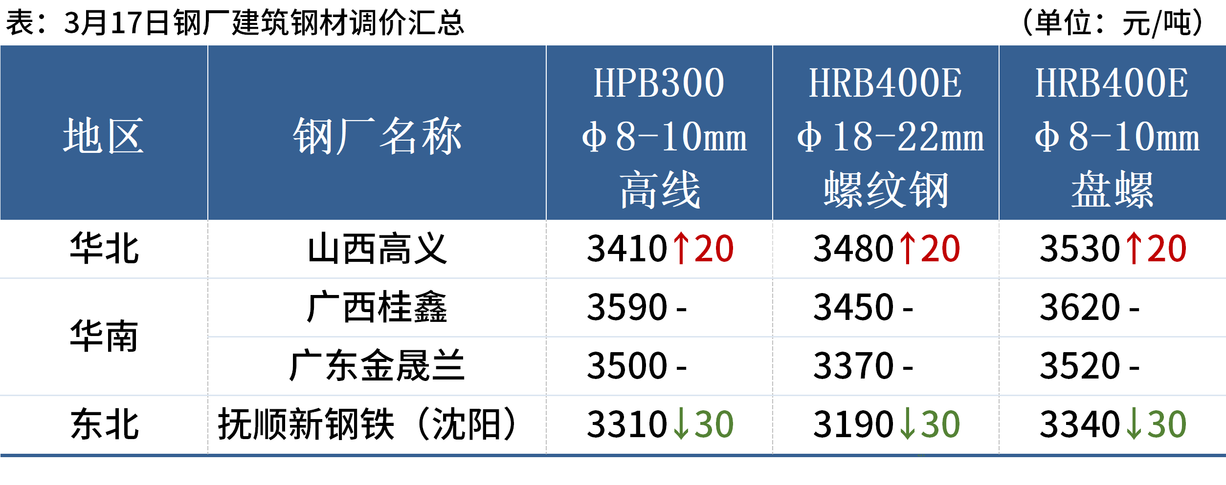 3月17日,1家钢厂建筑钢材出厂价上调20元/吨,1家钢厂下调30元/吨。