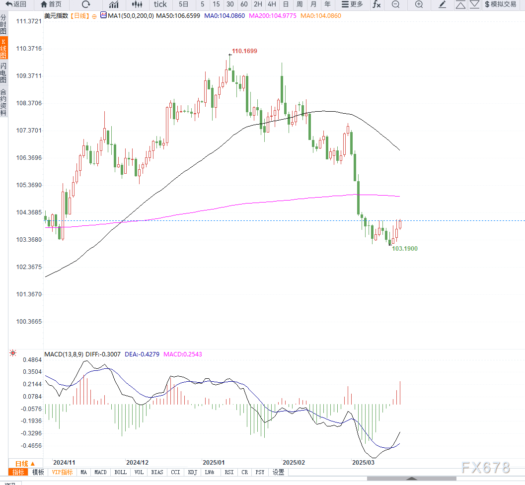 美元本周从低点反弹,既得益于美联储淡化降息预期,也与市场对贸易担忧的重新定价有关。年初,特朗普上台后的扩张性政策预期曾推高美元至110.17,但贸易摩擦升级引发的衰退焦虑令其回落至103.19。如今,随着关税落地临近,美元空头压力缓解,指数重回104上方。