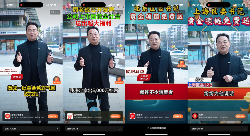 记者还发现,不同视频中的“北京区委书记欧阳兆杰”与“上海区委书记缪云”肖像相同,且被用于多个不同角色,包括广东上市金店周某福的周老板、马来西亚腾龙集团创始人黄振华等。经核实,北京、上海及广东均无上述姓名的“区委书记”。