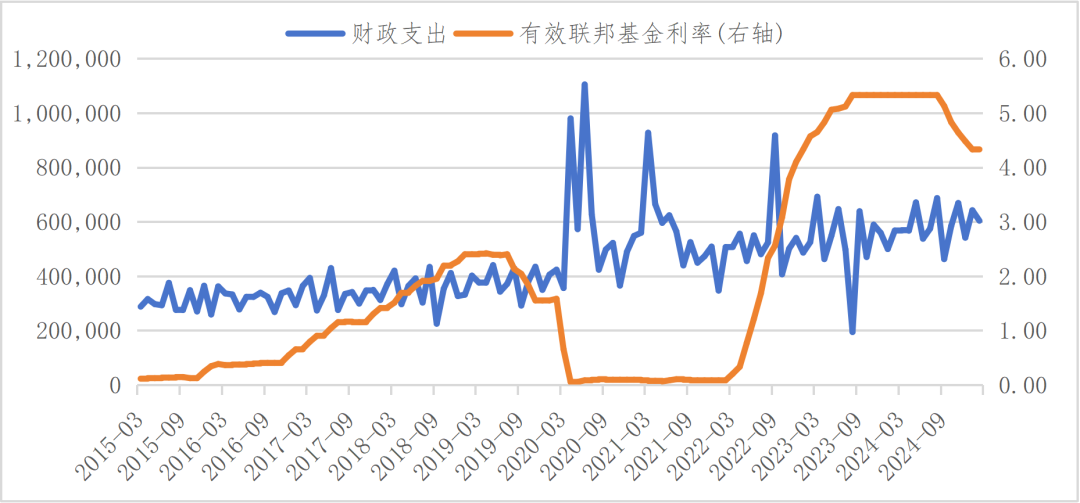 疫情后美国经济在高息下仍保持韧性的原因主要是美国财政扩张以及美股等居民资产端上涨支撑的消费。特朗普主动发起贸易战,关税不确定性打压了美国股市表现,且自2022年以来,美国高财政支出受到限制,逐步趋于平稳。