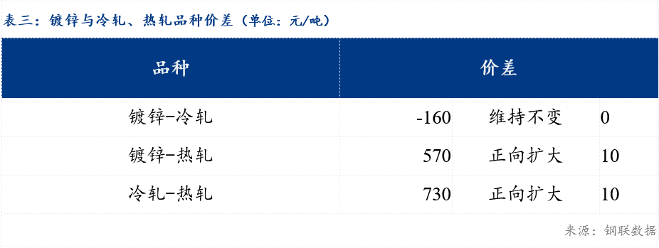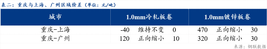 重庆、上海地区冷轧板卷区域价差维持不变,重庆、广州冷轧板卷区域价差缩小10元/吨;重庆、上海镀锌板卷区域价差缩小30元/吨,重庆、广州镀锌板卷区域价差缩小30元/吨。镀锌、冷轧品种价差维持不变;镀锌、热轧品种价差扩大10元/吨;冷轧、热轧品种价差扩大10元/吨。