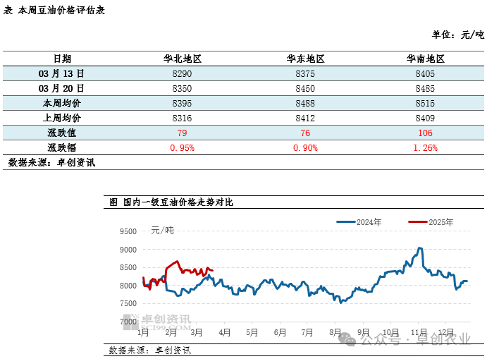 本周豆油价格震荡走高。截至本周四,本周国内一级豆油价格8406元/吨,环比上涨71元/吨,涨幅0.85%;周度均价为8444元/吨,环比上涨89元/吨,幅度1.07%。