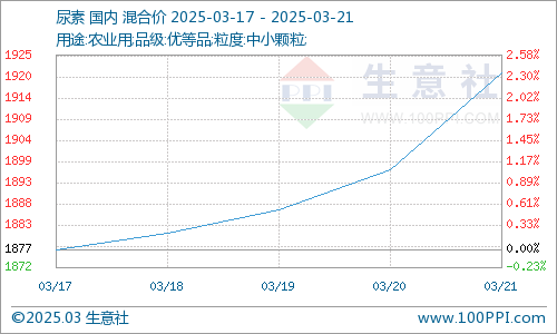 据生意社商品行情分析系统,截止3月21日,国内尿素市场参考均价为1921元/吨,较3月17日参考均价1877元/吨,国内尿素市场价格上涨幅度为2.34%。