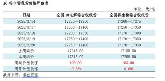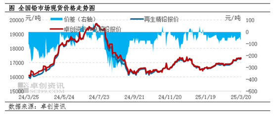 本周现货1#电解铅震荡上涨,价格累计涨幅0.14%。截至2025/3/20,卓创资讯现货1#电解铅报价17250-17400元/吨,均价17325元/吨,较上周四涨25元/吨,涨幅0.14%;较去年同期涨1225元/吨,涨幅7.61%;今年累计涨575元/吨,涨幅3.43%。本周均价17315元/吨,较前一周均价涨100元/吨,涨幅0.58%。本周下游接货需求尚可,叠加成本面支撑,铅价偏强运行。