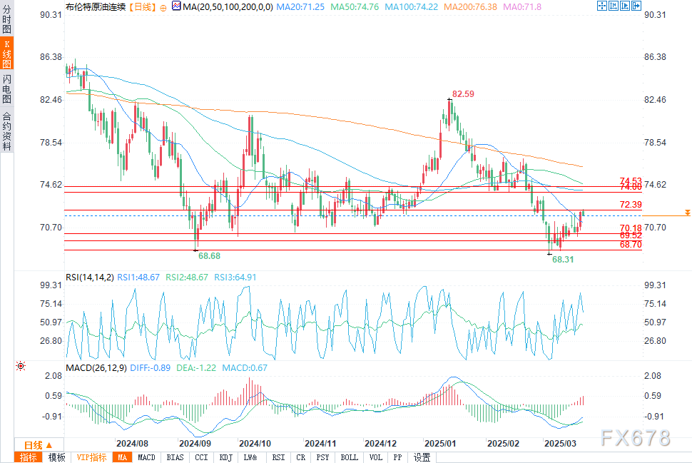 从技术分析的角度来看,自3月12日以来,布伦特原油一直维持在72.39至70.18的区间内。