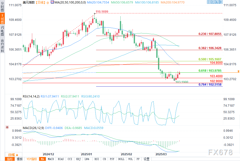汇通财经APP讯——周五(3月21日)欧盘时段,美元连续第三个交易日延续涨势,美元指数(DXY)攀升至104.02美元。这一走势反映出投资者在应对不断升级的贸易摩擦以及美联储的鸽派政策信号时,持续保持谨慎态度。