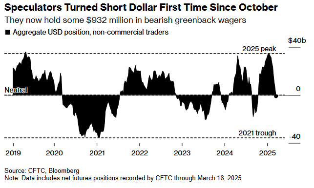这与1月中旬的情况截然相反,当时交易员持有价值340亿美元的美元多头头寸。这也是特朗普政策和对美国经济的质疑正在削弱美元前景的最新迹象。