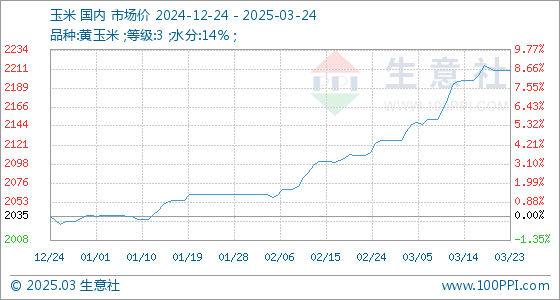 3月24日,生意社玉米基准价为2210.00元/吨,与本月初(2127.14元/吨)相比,上涨了3.90%。