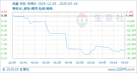 3月24日,生意社鸡蛋基准价为6.78元/公斤,与本月初(7.13元/公斤)相比,下降了-4.91%。