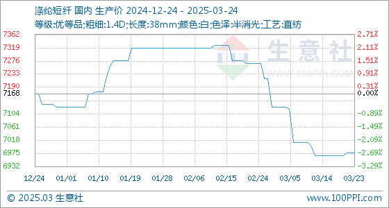 3月24日,生意社涤纶短纤基准价为6976.67元/吨,与本月初(7126.67元/吨)相比,下降了-2.10%。