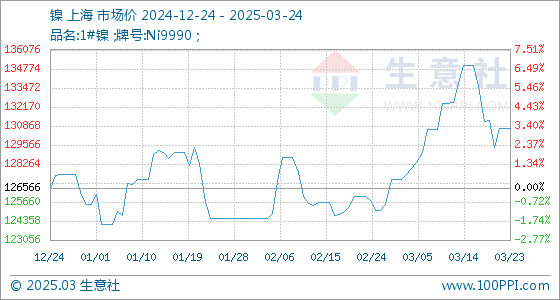 3月24日,生意社镍基准价为130666.67元/吨,与本月初(127216.67元/吨)相比,上涨了2.71%。
