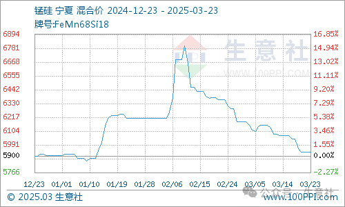 上周锰硅市场偏弱运行,锰硅盘面跌破新低,市场信心极速下降,大多以盘面点价为主,供应过剩问题较大,北方产区主流出货基差报价虽有所收缩,但价格仍低于厂家报价。据生意社商品行情分析系统,上周末锰硅宁夏地区的市场报价在5850-5950元/吨左右,市场均价5930元/吨,与上周初相比下跌1.82%。
