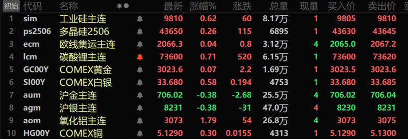 此外,氧化铝涨1.79%。碳酸锂涨0.71%,工业硅涨0.62%。多晶硅主力期货涨0.26%。