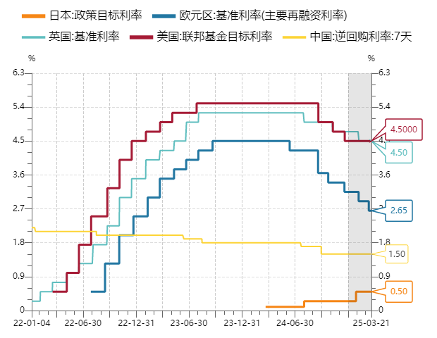 2025年3月,欧央行、加拿大央行、丹麦央行均在3月中旬宣布降息25个基点,瑞士央行在3月20日宣布将政策利率从0.5%下调至0.25%,为自2022年9月以来的最低利率,是连续第五次降息,符合预期。此外,巴西央行、乌克兰央行宣布加息1个百分点,土耳其央行宣布将隔夜贷款利率上调2个百分点。
