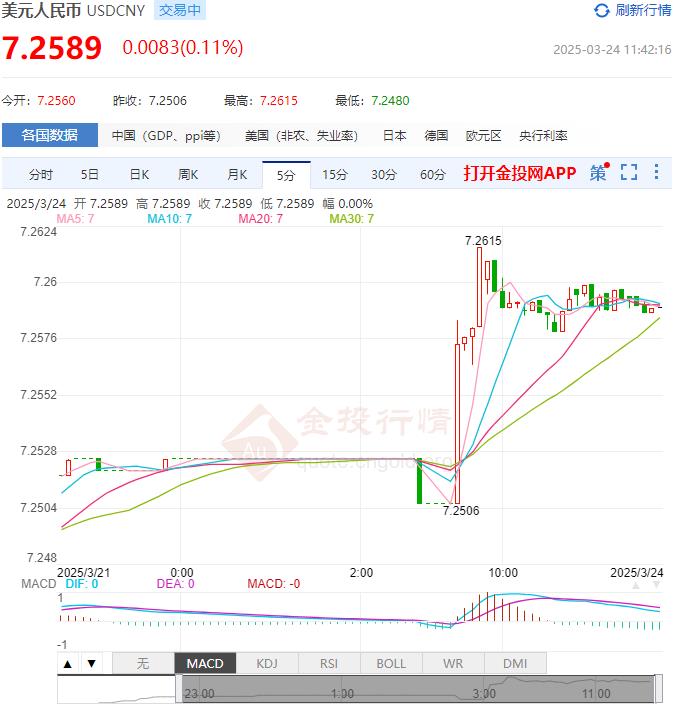 截至发稿,美元兑换人民币汇率报价7.2589,涨幅0.11%,最高价7.2615,最低价7.2480,今日美元/人民币汇率开盘价7.2560。