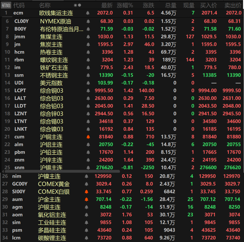此外,碳酸锂主连涨0.88%,工业硅主连涨1.08%,多晶硅主连涨0.24%。欧线集运主连涨0.31%。