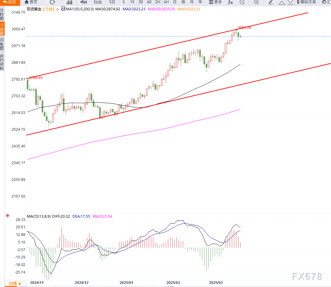 金价上周触及3057-3058美元历史高位后回落,当前守住3000美元关键支撑。短期支撑位在3000美元,跌破可能触发技术性卖盘,下探2982-2978美元,甚至2956-2954美元阻力转支撑区。