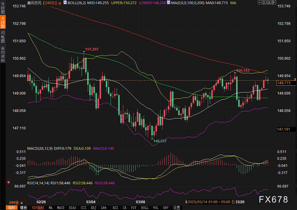 从240分钟图来看,美元兑日元近期在布林通道中轨(149.255)与上轨(150.27)之间窄幅震荡。当前报价位于149.712,MACD指标显示DIF(0.179)与DEA(0.109)在零轴上方黏合,短期多头力量虽占优,但动能不足;RSI三线均值为58.4,处于中性偏强区域,未进入超买区间,显示市场对突破仍持谨慎态度。