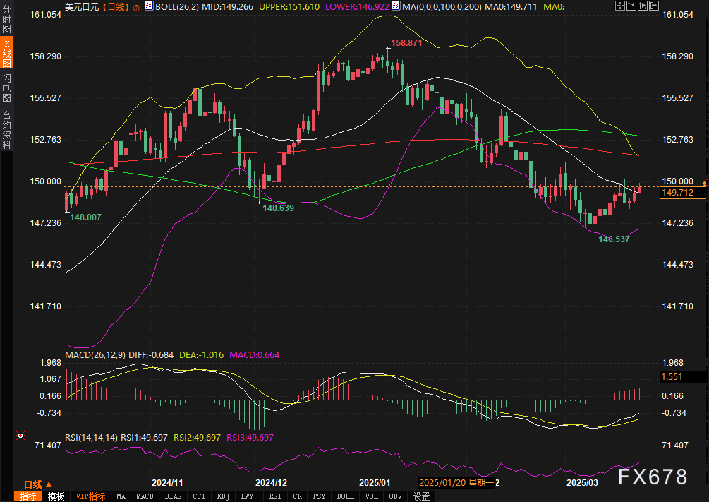 日线级别上,美元兑日元处于布林通道中轨(149.266)附近,上方200日移动平均线(151.78)与100日均线(153.09)构成长期压力带。MACD指标中,DIF(-0.684)与DEA(-1.016)在零轴下方收窄,柱状线转正,暗示空头动能衰减;RSI(14)三线均值49.7,处于中性区域,未提供明确方向信号。