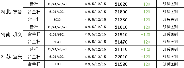 3月24日宁晋市场普铝杆现货报盘价21020元/吨,较上一交易日报价跌130元/吨;巩义市场普铝杆现货报盘价21010元/吨,较上一交易日报价跌120元/吨;宜兴市场普铝杆报盘价21110元/吨,较上一交易日报价跌120元/吨。