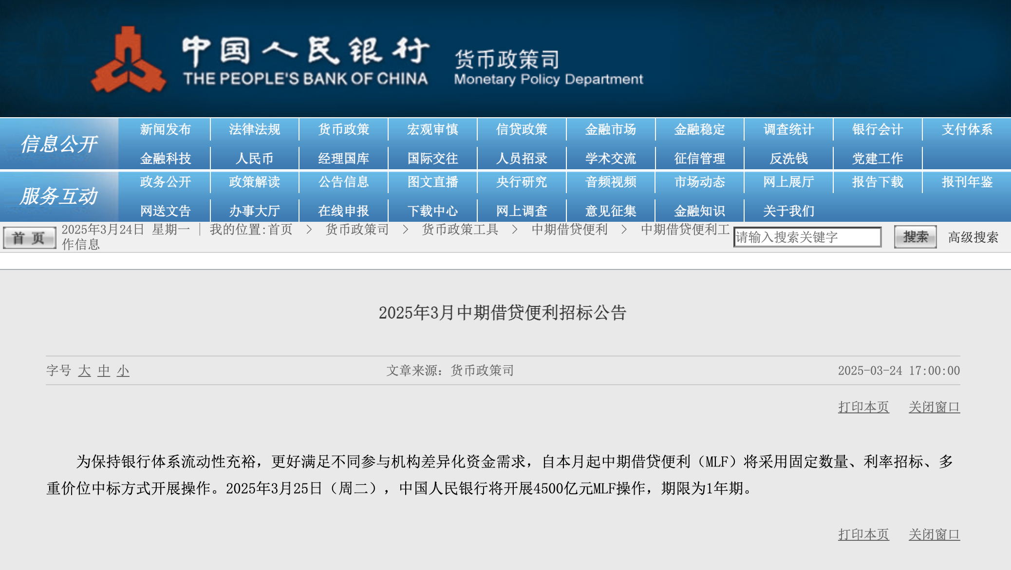 中国人民银行网站3月24日发布的《2025年3月中期借贷便利招标公告》显示,为保持银行体系流动性充裕,更好满足不同参与机构差异化资金需求,自本月起中期借贷便利(MLF)将采用固定数量、利率招标、多重价位中标方式开展操作。2025年3月25日(周二),中国人民银行将开展4500亿元MLF操作,期限为1年期。