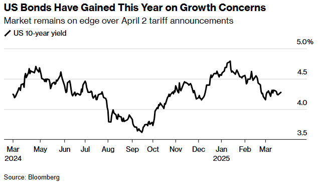 截至3月份,美国10年期债券收益率从1月中旬约4.80%的年内高点回落,交易区间相当窄。特朗普的关税和贸易战威胁引发了投资者对经济衰退的担忧,促使投资者抛售股票,转而购买安全的债券。