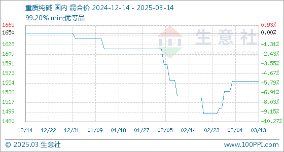 3月14日,生意社重质纯碱基准价为1558.00元/吨,与本月初(1538.00元/吨)相比,上涨了1.30%。