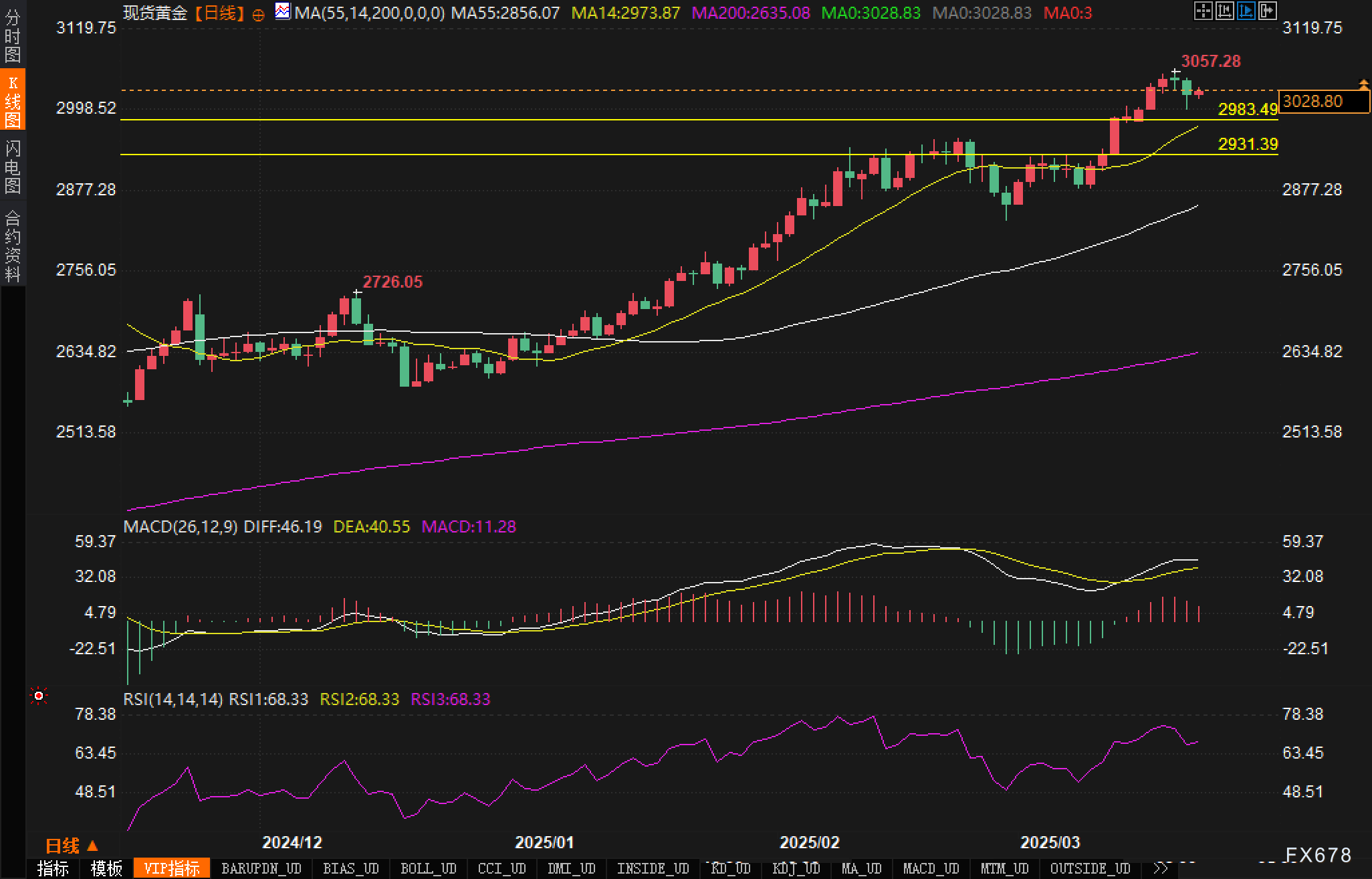黄金在日线图上展现出更为强劲的上涨势头。价格已经突破了3025的关键阻力,14日RSI指标读数为68.33,接近超买区域但尚未进入,说明上涨趋势仍有延续空间。MACD指标显示DIFF值为46.19,DEA为40.55,两线呈现金叉状态,且红色柱状体动能仍在,进一步确认了上行趋势。