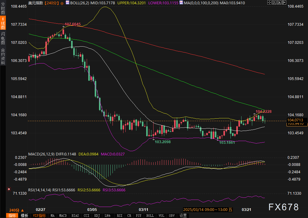 汇通财经APP讯——周一(3月24日),美元指数(DXY)近期在104水平附近窄幅震荡,市场焦点集中在4月2日关税政策动向及关键经济数据的发布。尽管美国政府的关税言论加剧了避险情绪,但部分国家可能被豁免的消息缓和了市场紧张氛围,美元短期走势呈现多空拉锯态势。本周消费者信心数据及核心PCE通胀指标即将公布,叠加俄乌局势谈判的不确定性,美元面临双向波动风险,技术面则指向关键阻力与支撑位的争夺。