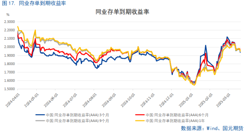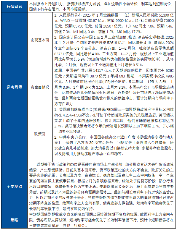 主要观点:近期关于货币政策的态度是否转向在市场上产生分歧,部分投资者认为央行货币政策趋紧,产生恐慌情绪。目前从基本面来看,货币政策宽松的大方向不会变,政府关注的主要是实施的范围、节奏以及力度,在稳增长、稳息差以及稳汇率三点中间权衡,拿一个主要的问题当做主要叙事背景。根据2月的各项数据来看,经济处于弱复苏阶段,部分行业出现回暖迹象,稳增长暂不作为主要矛盾。美联储降息节奏延后,稳汇率或成为当前主要矛盾。前期已经计入考量的部分降息预期需要修正,叠加前期长端利率下行过快的监管压力,所以近期利率的反弹属于修正。当前中短期国债到期收益率隐含的降息预期已经接近短期不降息的位置,故而利率上方空间有限,债券底部支撑较强,短端利率可能会优先于长端利率缓慢下行,最终在区间内保持。