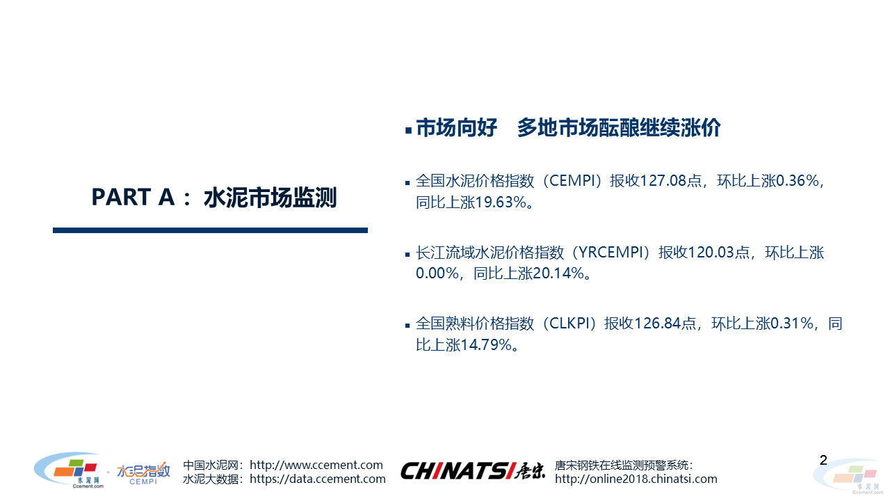 全国水泥价格指数(CEMPI)报收127.08点,环比上涨0.36%,同比上涨19.63%。长江流域水泥价格指数(YRCEMPI)报收120.03点,环比上涨0.00%,同比上涨20.14%。全国熟料价格指数(CLKPI)报收126.84点,环比上涨0.31%,同比上涨14.79%。