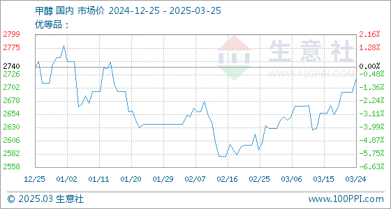 3月25日,生意社甲醇基准价为2720.00元/吨,与本月初(2629.17元/吨)相比,上涨了3.45%。