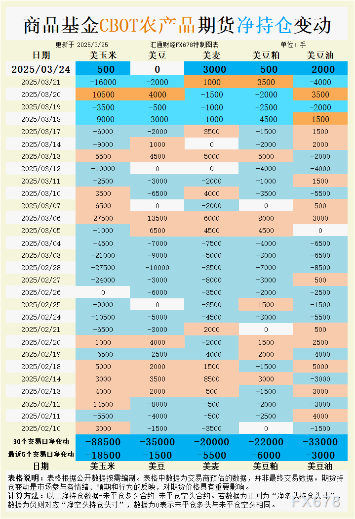汇通财经APP讯——周二(3月25日),CBOT谷物期货市场在周一(3月24日)呈现分化走势,小麦期货因俄乌局势谈判进展和美元走强承压明显,而玉米和大豆则在窄幅震荡中寻找方向。持仓数据方面,最新交易商预估显示,大宗商品基金在3月24日继续增加玉米、小麦、豆粕和豆油的净空头持仓,仅大豆维持净多头与净空头持平。过去5个交易日和30个交易日的持仓趋势也表明,基金对谷物市场的看空情绪持续加深。这种情绪叠加基差变化、国际交易动态以及即将于3月31日发布的USDA谷物库存和预期种植报告,短期内市场的不确定性正在放大。当前,CBOT 5月小麦期货结算价为5.48-1/4美元/蒲式耳,下跌10美分;5月玉米期货收于4.64-1/2美元/蒲式耳,微涨1/4美分;5月大豆期货报10.07-1/4美元/蒲式耳,下跌2-1/2美分;5月豆粕期货跌至298.1美元/短吨,下挫2.2美元;5月豆油期货则因空头增仓承压。